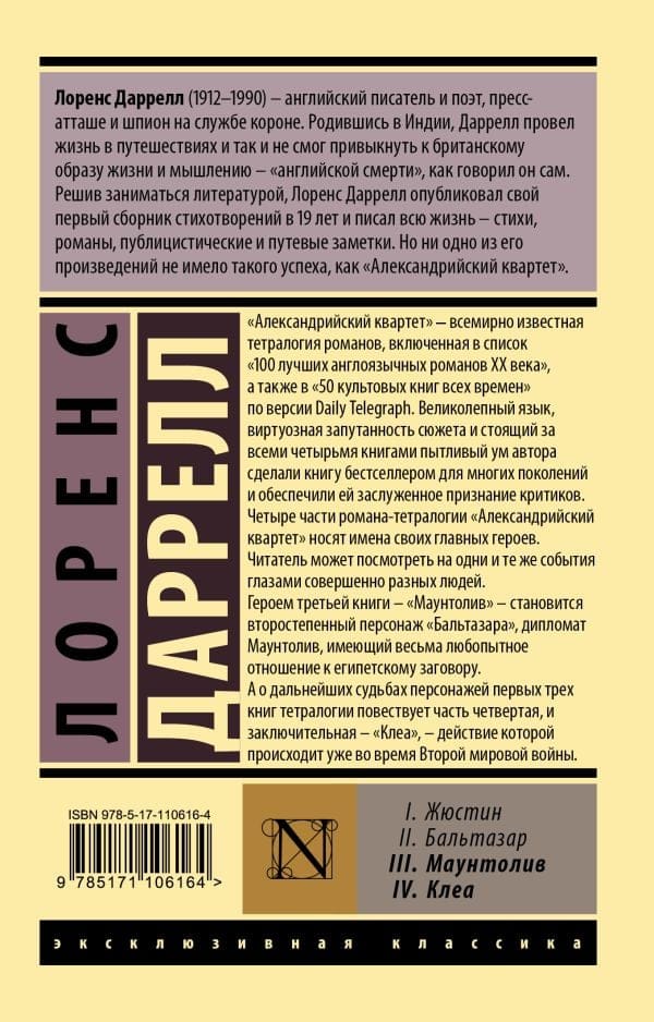 Четыре части романа-тетралогии «Александрийский квартет» носят имена своих главных героев. Читатель может посмотреть на одни и те же события глазами совершенно разных людей. Героем третьей книги – «Маунтолив» – становится второстепенный персонаж «Бальтазара», дипломат Маунтолив, имеющий весьма любопытное отношение к египетскому заговору. А о дальнейших судьбах персонажей первых трех книг тетралогии повествует часть четвертая, и заключительная – «Клеа», – действие которой происходит уже во время Второй мировой войны.