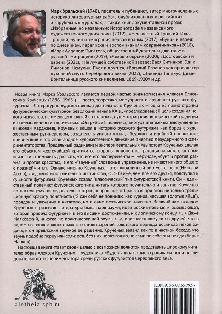 В настоящей книге рассказывается о жизни и деятельности в 1886–1921 гг. Алексея Елисеевича Крученых — одного из колонновожатых русского футуризма, поэта, художника, мемуариста, архивариуса и библиофила. Личность этого удивительного человека, считающегося самым радикальным поэтом-авангардистом эпохи Серебряного века, до сих пор остается в России на периферии исследовательских практик, занимающихся историей Великого эксперимента в отечественном искусстве начала ХХ столетия. Автор ставит своей целью с возможной полнотой представить широкому читателю образ художника, — «‎Из племени неукрощенных из роду несокрушенных»‎ (С. Кирсанов), — по жестокой прихоти судьбы долгие годы пребывавшего на родине в тени забвения.