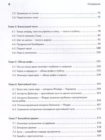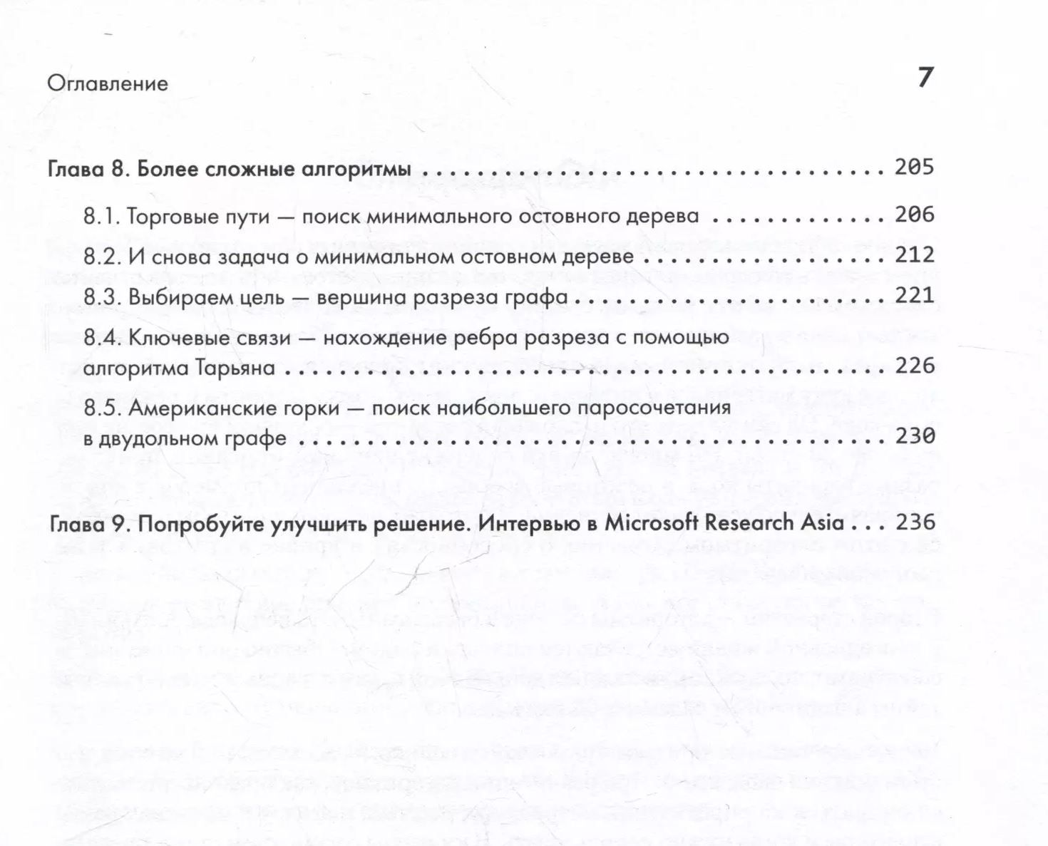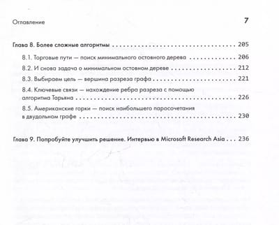 В число алгоритмов, рассмотренных в книге, вошли различные методы сортировки, перебор, поиск в глубину и ширину, обход графов, четыре алгоритма поиска кратчайшего пути, два алгоритма минимального остовного дерева, алгоритмы определения вершин и ребер разреза, а также поиск наибольшего паросочетания в двудольных графах и многое другое.
