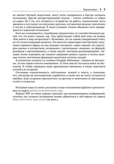 Цель этой книги – при помощи наглядных иллюстраций и исполняемых примеров кода помочь читателю понять ключевые идеи алгоритмов и структур данных и освоить их воплощение в программном коде. Если вам необходимо подготовиться к собеседованию или получить базовые навыки перед сложным курсом по программированию, но не хватает времени на чтение множества учебников от корки до корки, этот учебник станет для вас спасательным кругом в океане знаний.