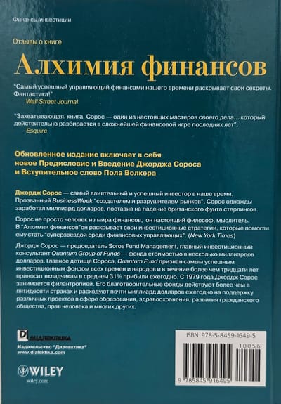 В своей книге "Алхимия финансов", выдержавшей несколько изданий и пользующейся непреходящим успехом, знаменитый финансист и спекулянт Джордж Сорос раскрывает свои секреты принятия решений при игре на бирже. Кроме того, он предлагает читателю собственную философию, согласно которой не только игроки влияют на рынок, но и рынок влияет на игроков. Этот процесс Джордж Сорос называет рефлексивным взаимодействием. Кроме того, в книге дается анализ общественно-политических событий, происходящих в конце 1985 - начале 1986 гг.