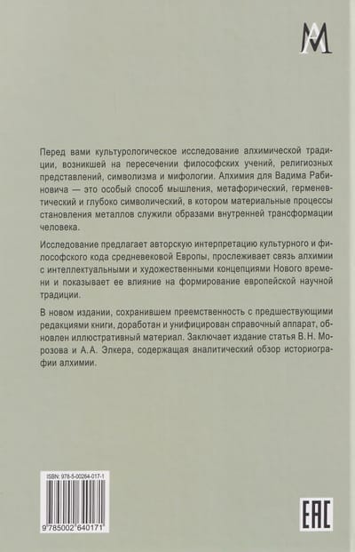 Перед вами культурологическое исследование алхимической традиции, возникшей на пересечении философских учений, религиозных представлений, символизма и мифологии. Алхимия для Вадима Рабиновича — это особый способ мышления, метафорический, герменевтический и глубоко символический, в котором материальные процессы становления металлов служили образами внутренней трансформации человека.