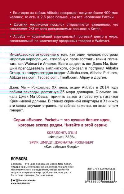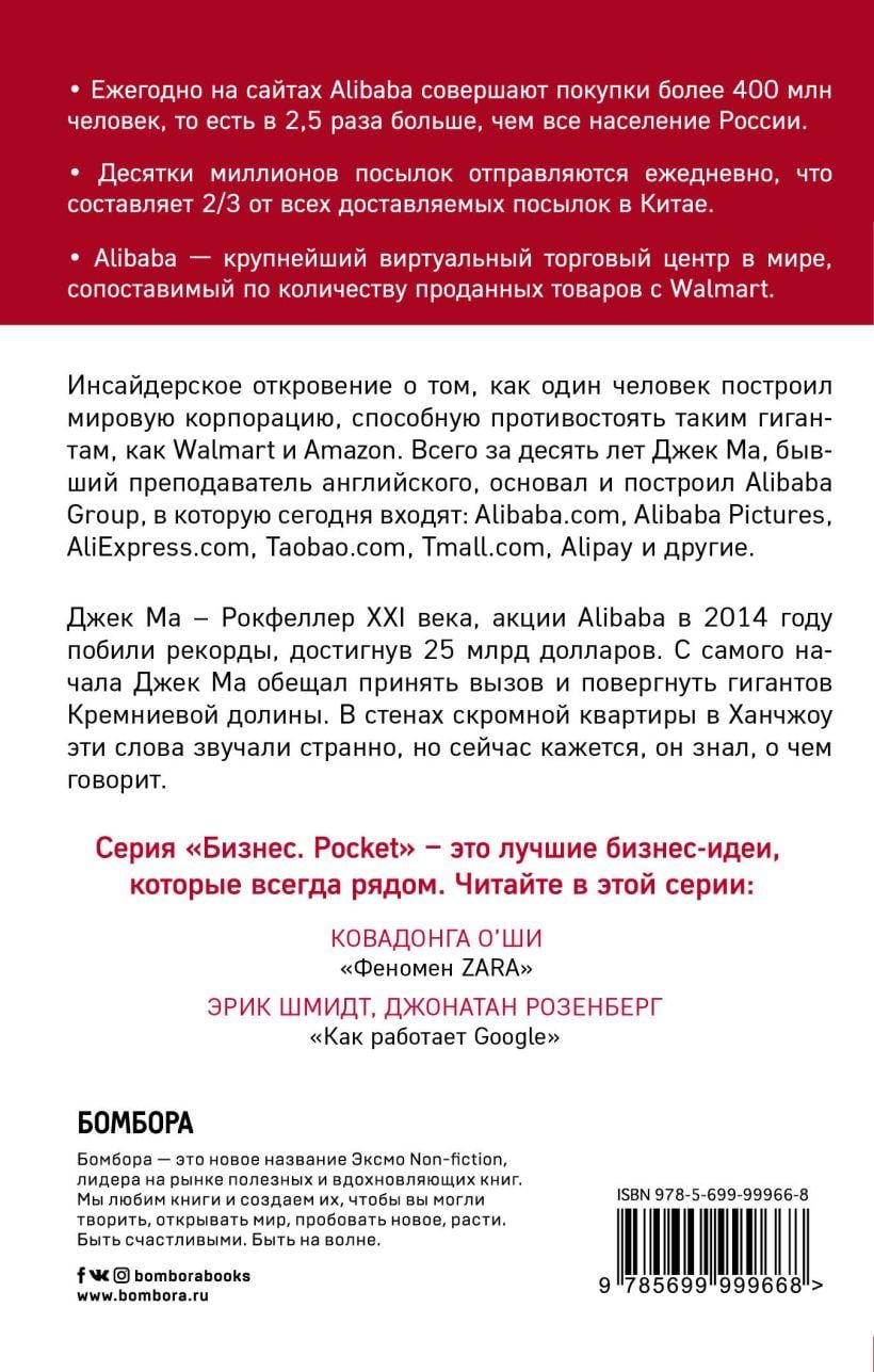 Инсайдерское откровение о том, как один человек построил мировую корпорацию, способную противостоять таким гигантам, как Walmart и Amazon. Всего за десять лет Джек Ма, бывший преподаватель английского, основал и построил Alibaba Group, в которую сегодня входят: Alibaba.com, Alibaba Pictures, AliExpress.com, Taobao.com, Tmall.com, Alipay и другие.