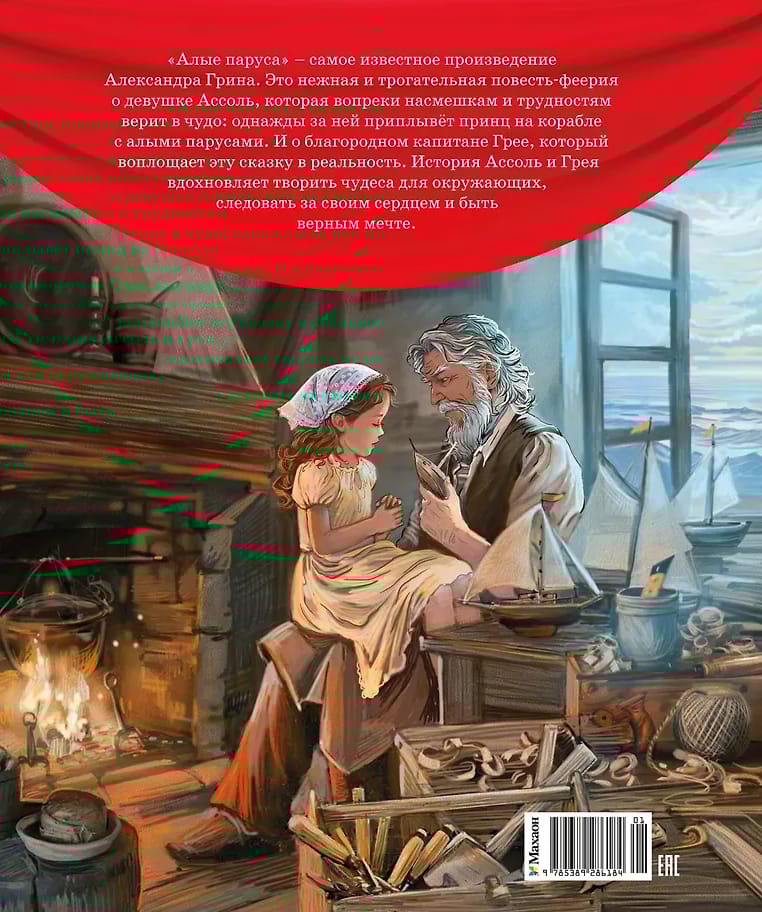 «Алые паруса» – самое известное произведение Александра Грина. Это нежная и трогательная повесть-феерия о девушке Ассоль, которая вопреки насмешкам и трудностям верит в чудо: однажды за ней приплывёт принц на корабле с алыми парусами. И о благородном капитане Грее, который воплощает эту сказку в реальность. История Ассоль и Грея вдохновляет творить чудеса для окружающих, следовать за своим сердцем и быть верным мечте.