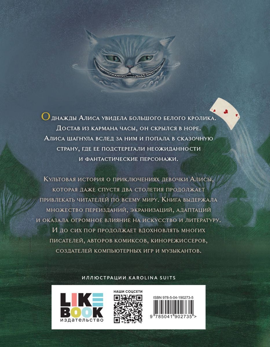 Однажды Алиса увидела большого белого кролика. Достав из кармана часы, он скрылся в норе. Алиса шагнула вслед за ним и попала в сказочную страну, где ее подстерегали неожиданности и фантастические персонажи. Книга выдержала множество переизданий, экранизаций, адаптаций и оказала огромное влияние на искусство и литературу. И до сих пор продолжает вдохновлять многих писателей, авторов комиксов, кинорежиссеров, создателей компьютерных игр и музыкантов. Иллюстрации на обложку и для блока этого издания нарисовала талантливая и популярная художница Karolina Suits. Культовая история о приключениях девочки Алисы, которая даже спустя два столетия продолжает привлекать читателей по всему миру. Книга выдержала множество переизданий, экранизаций, адаптаций и оказала огромное влияние на искусство и литературу. И до сих пор продолжает вдохновлять многих писателей, авторов комиксов, кинорежиссеров, создателей компьютерных игр и музыкантов.