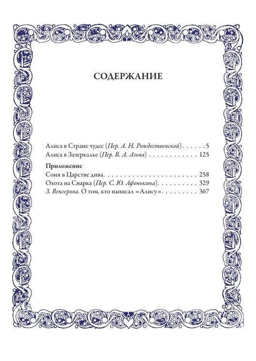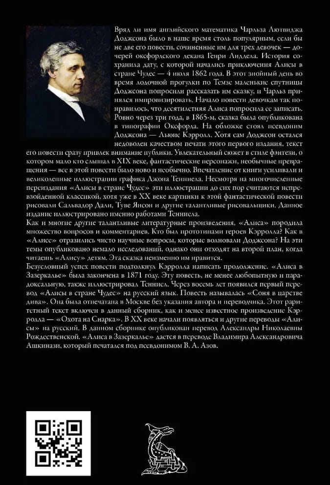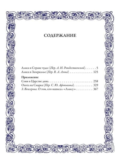 Благодаря труду талантливых переводчиков приключения Алисы в Стране чудес и в Зазеркалье давно стали классикой литературы для российских читателей. В Англии первая из двух этих книг, написанных математиком Чарльзом Лютвиджем Доджсоном, который теперь более известен по своему литературному псевдониму как Льюис Кэрролл, вышла в свет в 1865 году. Читателей привлекли не только удивительные приключения главной героини, но и великолепные иллюстрации, выполненные английским художником Джоном Тенниелом. Текст «Алисы в Стране чудес» дается в переводе Александры Николаевны Рождественской. Ее перевод Кэрролла под названием «Приключения Алисы в волшебной стране» сначала публиковался в 1908-1909 гг. в журнале «Задушевное слово» (том 49, №№ 1-7, 9-21, 22-33). Он считается первым переводом истории Кэрролла на русский. В 1911 г. под названием «Приключения Алисы в Стране чудес» был переиздан в серии «Золотая библиотека» в петербургской типографии «Вольф». «Алиса в Зазеркалье» дается в переводе В. А. Азова (литературный псевдоним Владимира Александровича Ашкинази). Его перевод «Алисы в Зазеркалье» остается значимым вкладом в русскую культуру.