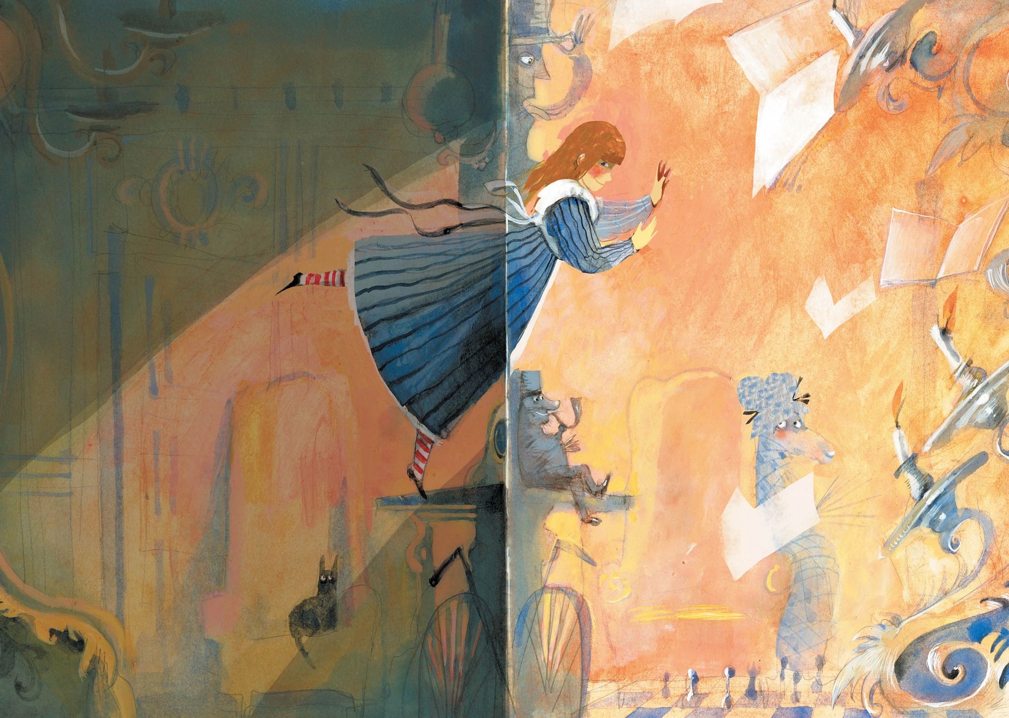 Героиня этой сказочной повести Алиса проходит сквозь зеркало и оказывается в мире, который представляет собой огромную шахматную доску. Там она становится белой пешкой. Много фантастических приключений переживёт Алиса, прежде чем преодолеет все препятствия и доберётся до нужной клетки, где по правилам шахматной игры превратится в королеву. Вот только все эти необыкновенные происшествия – красочный сон Алисы и чудесная выдумка автора этой книги англичанина Доджсона, чьи серьёзные занятия математикой и духовный сан не вязались с сочинением шутливых детских стихов со множеством парадоксов и небылиц. Скрываясь под псевдонимом Льюис Кэрролл, он тем не менее создал одну из самых причудливых сказок в мире, которой зачитываются и взрослые и дети.
