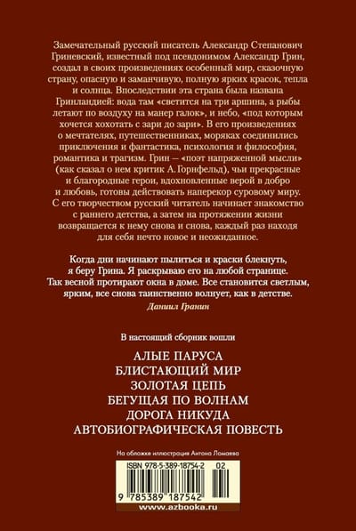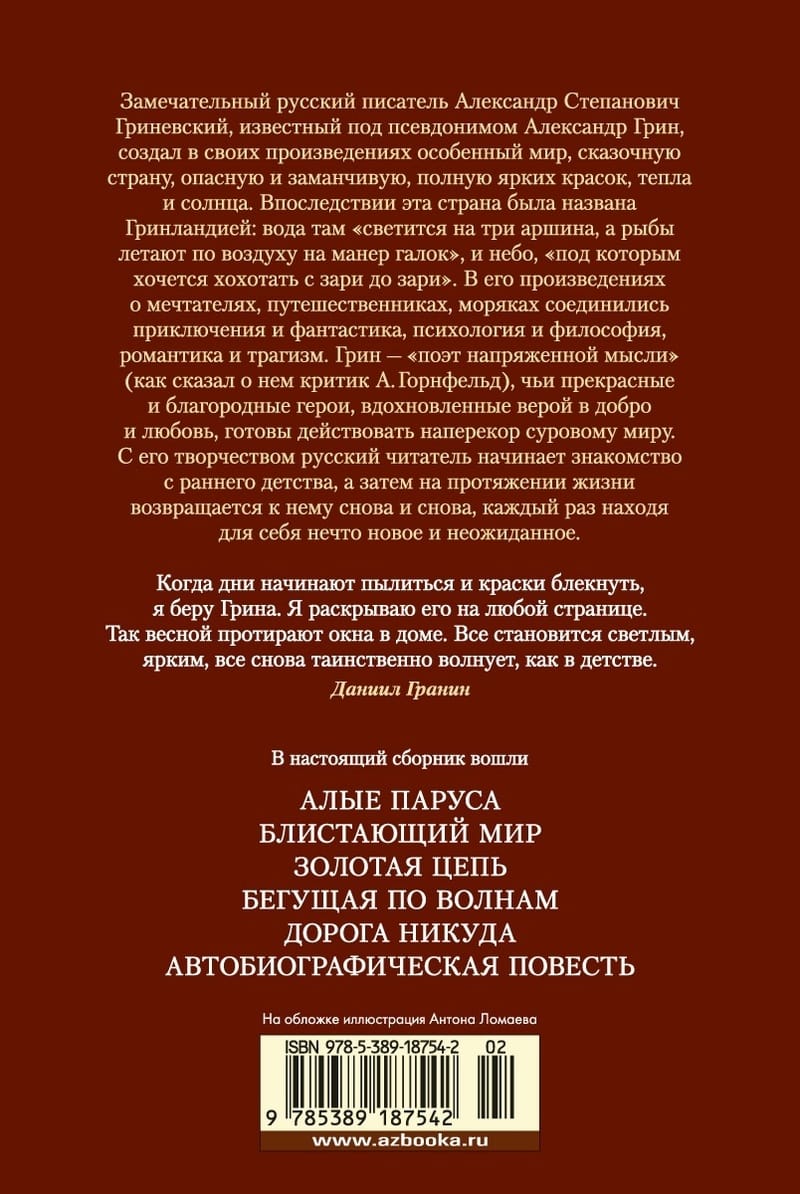 В настоящий сборник включены повесть-феерия «Алые паруса», романы «Блистающий мир», «Золотая цепь», «Бегущая по волнам» и «Дорога никуда», а также поздняя «Автобиографическая повесть».