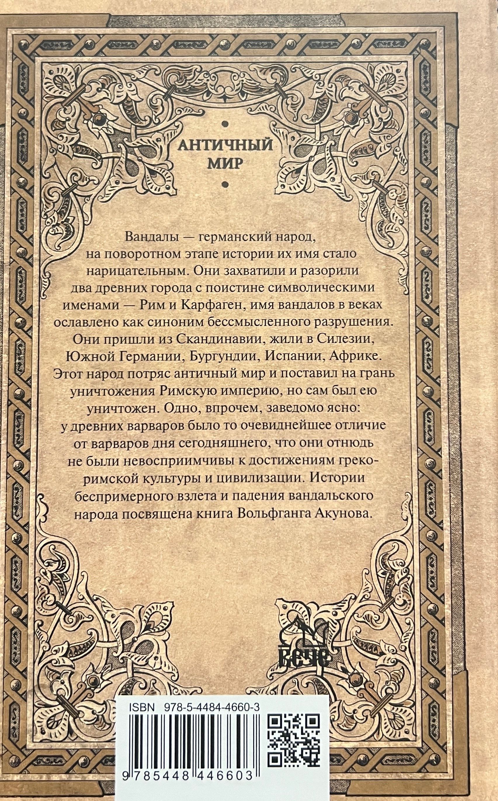 Вандалы — германский народ, на поворотном этапе истории их имя стало нарицательным. Они захватили и разорили два древних города с поистине символическими именами — Рим и Карфаген, имя вандалов в веках ославлено как синоним бессмысленного разрушения. Они пришли из Скандинавии, жили в Силезии, Южной Германии, Бургундии, Испании, Африке. Этот народ потряс античный мир и поставил на грань уничтожения Римскую империю, но сам был ею уничтожен. Одно, впрочем, заведомо ясно: у древних варваров было то очевиднейшее отличие от варваров дня сегодняшнего, что они отнюдь не были невосприимчивы к достижениям греко-римской культуры и цивилизации. Истории беспримерного взлета и падения вандальского народа посвящена книга Вольфганга Акунова.