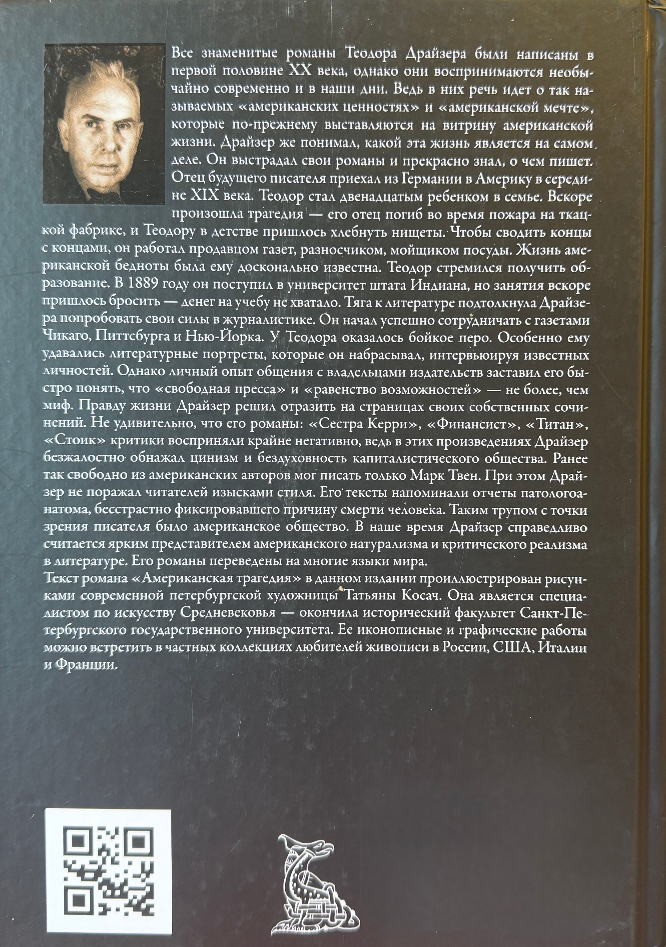 Роман «Американская трагедия» знаменитого американского писателя-реалиста Теодора Драйзера стал вершиной творчества писателя. Книга рассказывает о том, как стремление вырваться из низов общества и реализовать «американскую мечту» приводит молодого человека к убийству. Текст дан в переводе Зинаиды Вершининой и Норы Галь. Издание проиллюстрировано рисунками современной художницы Татьяны Косач.