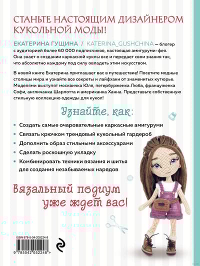 В своей новинке популярный блогер Екатерина Гущина приглашает вас за кулисы недели вязаной моды. Посетите модные столицы мира и узнайте все секреты и лайфхаки от знаменитых кутюрье. Моделями выступят москвичка Юля, петербурженка Люба, француженка Софи, американка Ханна и англичанка Шарлотта. Представьте собственную стильную коллекцию одежды для кукол!