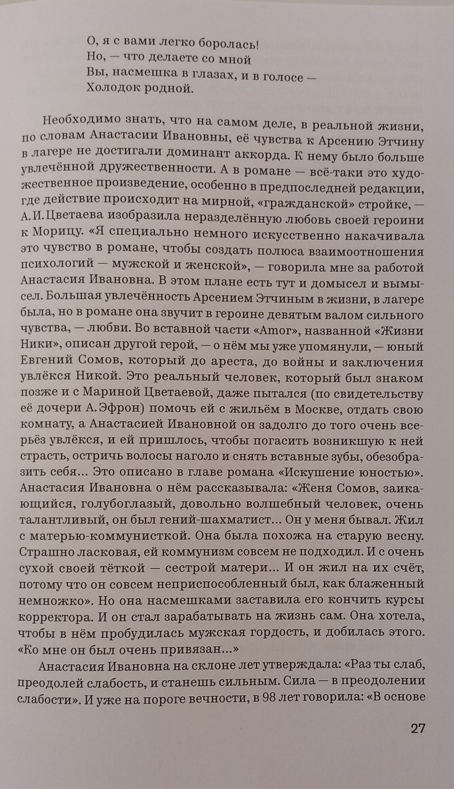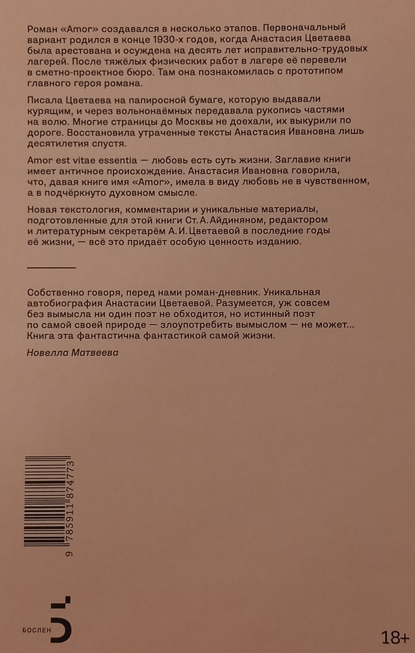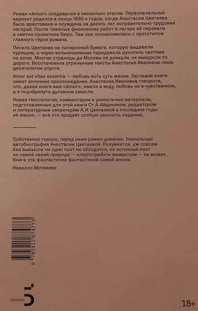 Автобиографический психологический роман «Amor» написан Анастасией Цветаевой (1894–1993), признанным мастером мемуарного жанра. Издание расширено по авторизованной машинописи и представляет собой текст в том виде, который сама автор хотела видеть в печати. Книга дополнена разделом «Из тетради Ники»: это стихи, написанные специально для романа, в несокращённом виде они публикуются впервые. Героиня романа Ника, от лица которой ведётся повествование, пишет свою жизнь для главного героя, Морица, чтобы быть понятой им. Она говорит ему о пережитом, о высоте своих чувств и преодолений и зовёт его к этой высоте. Одновременно он рассказывает ей о своих увлечениях, о своей жизни. Постепенно Ника понимает, что описать трудный, трагический период своего жизненного пути ей нужно скорее для самопонимания, для самой себя. Роман «Amor» дополняет знаменитые двухтомные «Воспоминания» Анастасии Цветаевой.