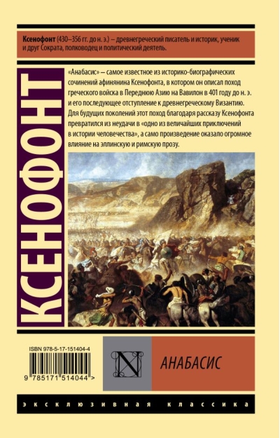 Ксенофонт (430 г. до н.э. – 356 г. до н.э.) – древнегреческий писатель и историк, ученик и друг Сократа, полководец и политический деятель. «Анабасис» - самое известное из историко-биографических сочинений афинянина Ксенофонта, в котором он описал поход греческого войска в Переднюю Азию на Вавилон в 401 году до н.э. и его последующее отступление к древнегреческому Византию. Для будущих поколений этот поход благодаря рассказу Ксенофонта превратился из неудачи в «одно из величайших приключений в истории человечества», а само произведение оказало огромное влияние на эллинскую и римскую прозу.