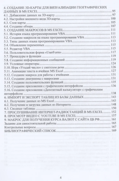 Изложена работа с формулами, встроенными функциями, таблицами, диаграммами, визуализацией данных на географических картах, импорт данных из различных источников и Интернет-ресурсов, а также разработка макросов на языке программирования VBA. Темы упорядочены от простых по основам работы до более сложных, связанных с разработкой программных приложений с графическим интерфейсом. Стиль изложения материала основан на пошаговом описании действий с рисунками (скриншотами) полученных результатов на каждом этапе выполнения. Пособие позволяет освоить работу в программе Microsoft Excel и может быть использовано как для самостоятельного изучения, так и для проведения лабораторных, практических работ и научно-технических вычислений.