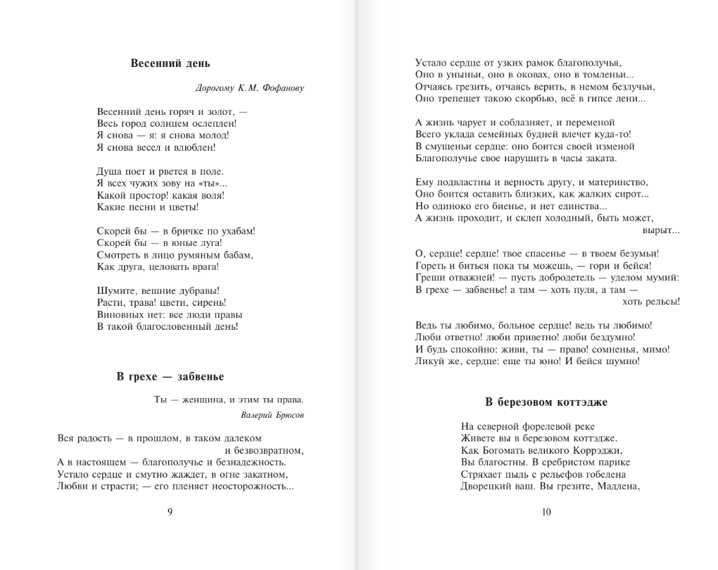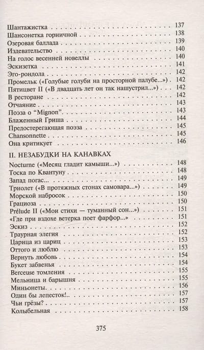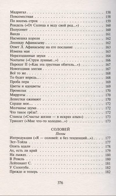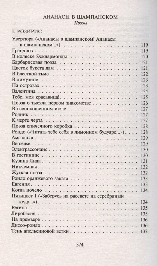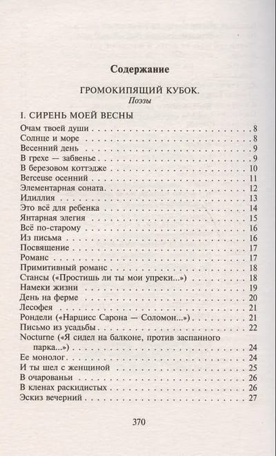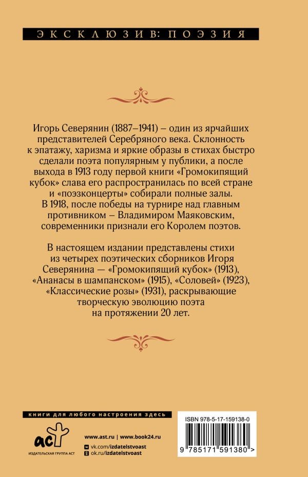 В настоящем издании представлены стихи из четырех поэтических сборников Игоря Северянина — «Громокипящий кубок» (1913), «Ананасы в шампанском» (1915), «Соловей» (1923), «Классические розы» (1931), раскрывающие творческую эволюцию поэта на протяжении 20 лет.
