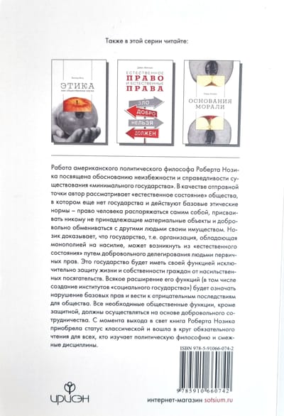 Работа американского политического философа Роберта Нозика посвящена обоснованию неизбежности и справедливости существования «минимального государства». В качестве отправной точки автор рассматривает «естественное состояние» общества, в котором еще нет государства и действуют базовые этические нормы – право человека распоряжаться самим собой, присваивать никому не принадлежащие материальные объекты и добровольно обмениваться с другими людьми своим имуществом. Нозик доказывает, что государство, т.е. организация, обладающая монополией на насилие, может возникнуть из «естественного состояния» путем добровольного делегирования людьми первичных прав. Это государство будет иметь своей функцией исключительно защиту жизни и собственности граждан от насильственных посягательств. Всякое расширение его функций (в том числе создание институтов «социального государства») будет означать нарушение базовых прав и вести к отрицательным последствиям для общества. Все необходимые общественные функции, кроме защитной, должны осуществляться на основе добровольного сотрудничества. С момента выхода в свет книга Роберта Нозика приобрела статус классической и вошла в круг обязательного чтения для всех, кто изучает политическую философию и смежные дисциплины. Она будет полезна специалистам в сфере политической философии, политологии, экономики, права, социологии, а также студентам и преподавателям соответствующих специальностей.