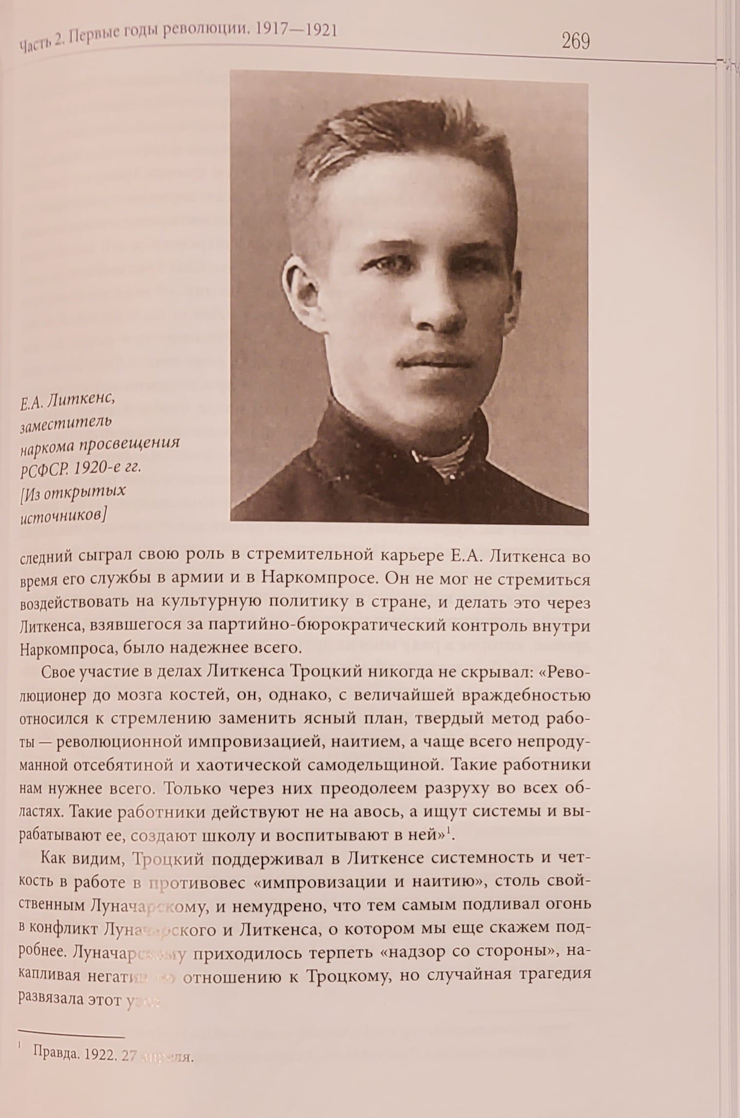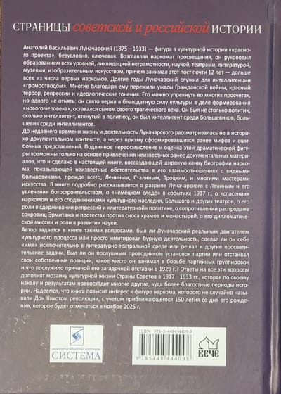 Анатолий Васильевич Луначарский (1875-1933) — фигура в культурной истории «‎красного проекта»‎, безусловно, ключевая. Возглавляя Наркомат просвещения, он руководил образованием всех уровней, ликвидацией неграмотности, наукой, театром, литературой, музеями, изобразительным искусством, причем занимал этот пост почти 12 лет — дольше всех из числа первых наркомов. Долгие годы Луначарский служил для интеллигенции «‎громоотводом»‎. Многие благодаря ему пережили ужасы Гражданской войны, «‎красный террор»‎, репрессии и идеологические гонения. Его можно упрекнуть во многих просчетах, но одного не отнять: он свято верил в благодатную силу культуры в деле формирования «‎нового человека»‎, оставался сыном своего трагического века.