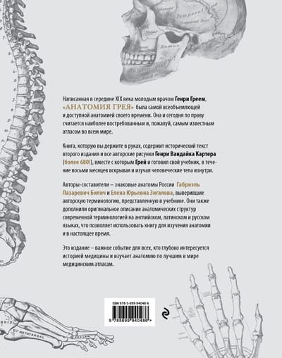 Подарочное издание с иллюстрациями из «Анатомии Грея» — классического учебника анатомии человека 1858 года. Более 600 роскошных оригинальных рисунков с сохраненными авторскими подписями на английском языке. Российскими ученые-медики Габриэль Лазаревич Билич и Елена Юрьевна Зигалова дополнили книгу указателями анатомических структур на латинском и русском языках, чтобы атлас и сейчас прекрасно подходил для изучения анатомии и подготовки к экзаменам.