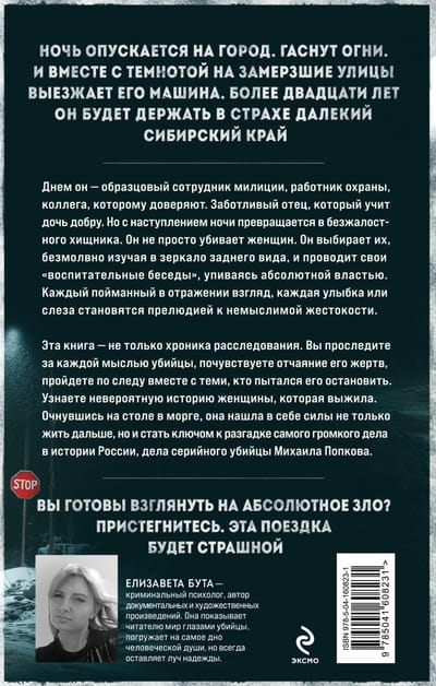 Эта книга — не только хроника расследования. Вы проследите за каждой мыслью убийцы, почувствуете отчаяние его жертв, пройдете по следу вместе с теми, кто пытался его остановить. И вы узнаете невероятную историю женщины, которая выжила. Очнувшись на столе в морге, она нашла в себе силы не только жить дальше, но и стать ключом к разгадке самого громкого дела в истории России, дела серийного убийцы Михаила Попкова.