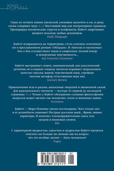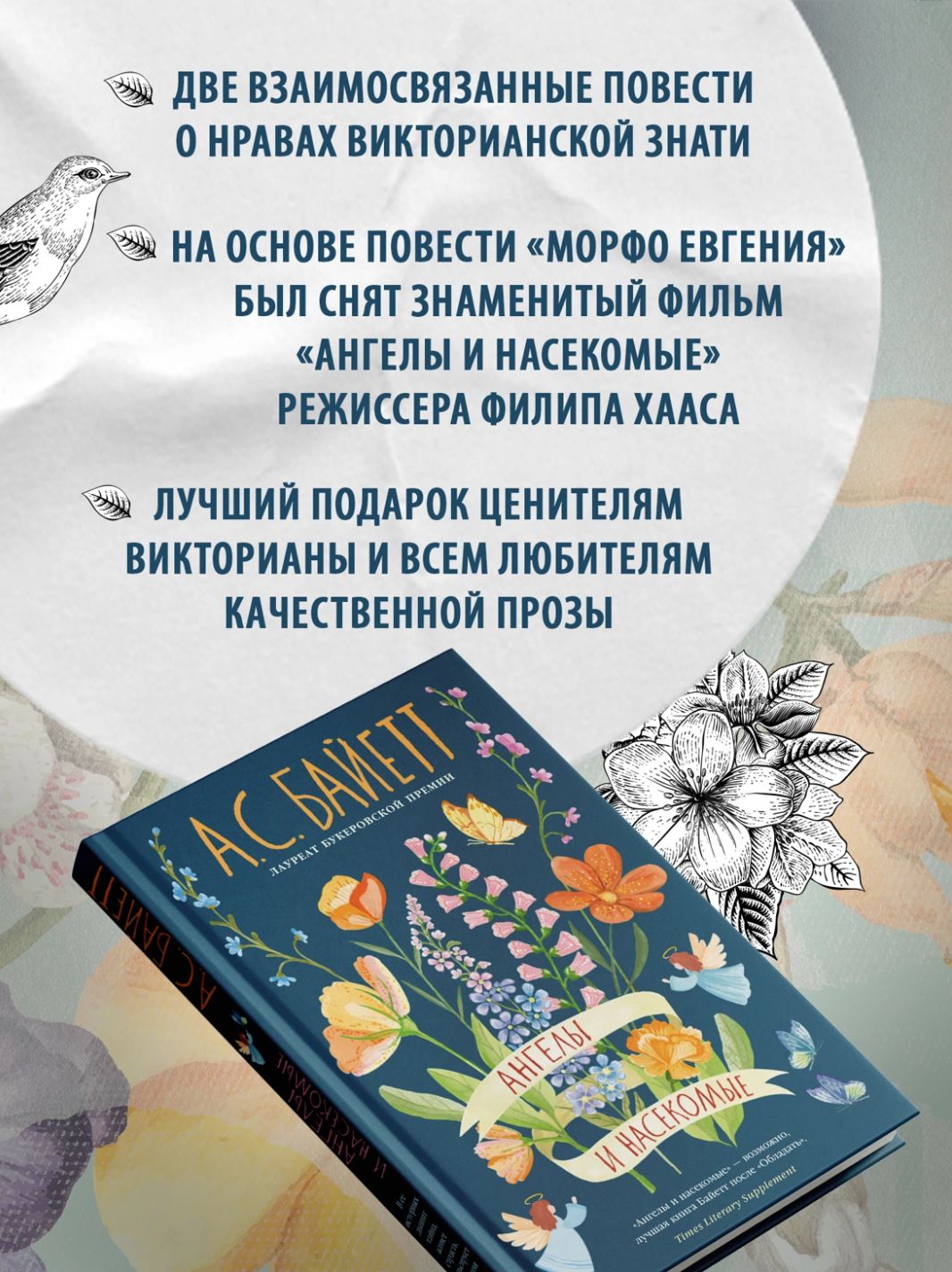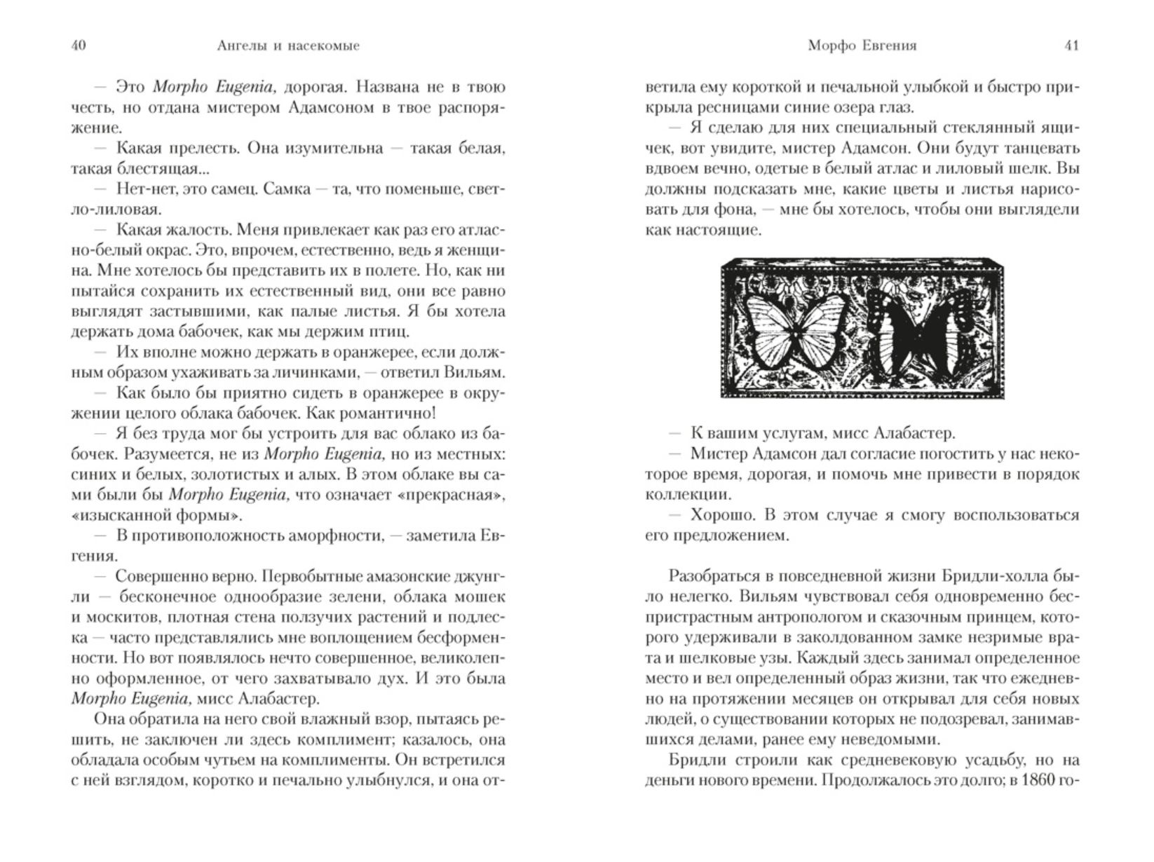 От автора удостоенного Букеровской премии романа «Обладать», «Квартета Фредерики» и «Детской книги», от кавалерственной дамы ордена Британской империи — две взаимосвязанные повести о нравах викторианской знати, объединенные под общим названием «Ангелы и насекомые». Это — «возможно, лучшая книга Байетт после „Обладать“» (Times Literary Supplement). Искренность чувств сочетается здесь с интеллектуальной игрой, историческая достоверность — с вымыслом. Здесь потерпевший кораблекрушение натуралист пытается найти счастье в семье, где тайные страсти так же непостижимы, как и поведение насекомых, а увлекающиеся спиритизмом последователи шведского мистика Сведенборга и вправду оказываются во власти призрака…
