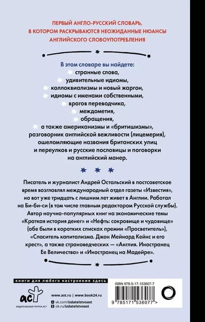 Эта книга представляет собой первый англо-русский словарь, в котором раскрываются неожиданные нюансы английского словоупотребления. В нем вы найдете: странные слова, удивительные идиомы, коллоквиализмы и новый жаргон, идиомы с именами собственными, врагов переводчика, междометия, обращения, а также американизмы и «бритишизмы», разговорник английской вежливости (лицемерия), ошеломляющие названия британских улиц и переулков и русские пословицы и поговорки на английский манер.