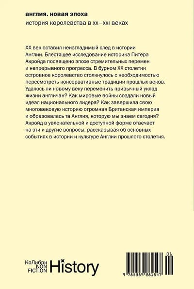 Книгу открывают события начала ХХ века: завершение Англо-бурской войны, правление Эдуарда VII, имперские кризисы и Первая мировая война. Питер Акройд проводит читателя через страшные годы Второй мировой войны, поставившей под угрозу независимость островного государства, правление Георга VI, преобразование империи в Содружество наций и новую Елизаветинскую эпоху. К рубежу тысячелетий, до которого доходит повествование, за время правления Елизаветы II сменилось десять премьер-министров, самыми известными из которых стали Уинстон Черчилль, Гарольд Вильсон, Маргарет Тэтчер и Тони Блэр. Однако история Англии не прекращает свой ход.