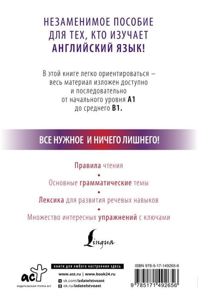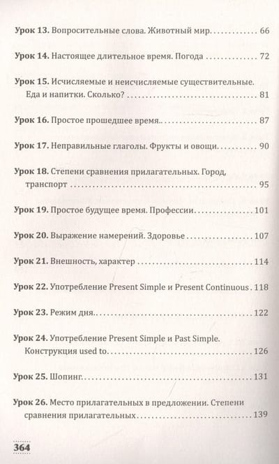В самоучителе использована специальная методика для начинающих изучение английского языка с нуля. Материал подается от простого к сложному, от глагола to be до условного наклонения. Грамматические темы чередуются с лексическими, развивающими речевые навыки. Постепенно формируются умения задавать вопросы и отвечать на них, рассказывать о себе и знакомых людях, обсуждать прочитанную книгу, увиденный фильм или спектакль, описывать окружающий мир, общаться с врачом или полицией и т. п. В каждом уроке даются упражнения, сопровождаемые ключами для самопроверки.Усваивая в заданном объеме предлагаемую лексику, изучая грамматические сведения, добросовестно выполняя упражнения, можно уверенно овладеть английским языком в рамках уровня B1.