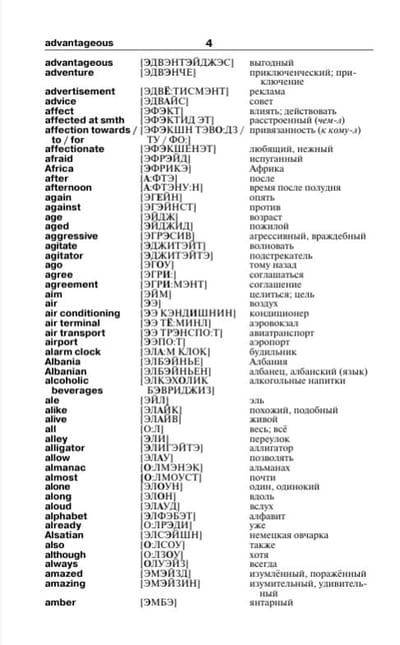 В каждой части содержится по 4000 самых употребительных слов. Все слова снабжены транскрипцией русскими буквами, причем в русско-английской части тоже дается транскрипция английских слов.