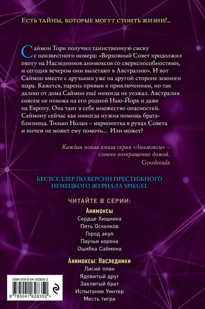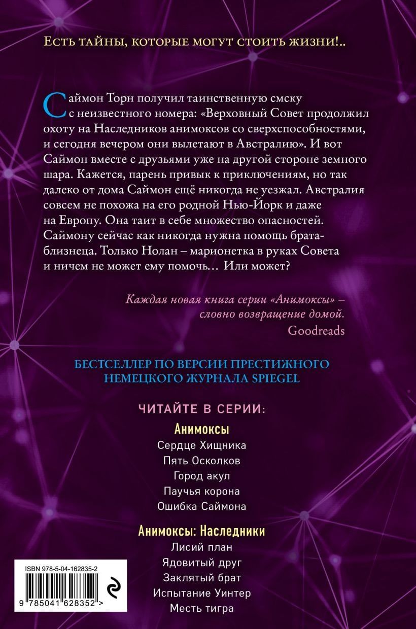Саймон Торн получил таинственную эсэмэску с неизвестного номера: «Верховный Совет продолжил охоту на Наследников анимоксов со сверхспособностями, и сегодня вечером они вылетают в Австралию». И вот Саймон вместе с друзьями уже на другой стороне земного шара. Кажется, парень привык к приключениям, но так далеко от дома Саймон ещё никогда не уезжал. Австралия совсем не похожа на его родной Нью-Йорк и даже на Европу. Она таит в себе множество опасностей. Саймону сейчас как никогда нужна помощь брата-близнеца, только Нолан — марионетка в руках Совета и ничем не может ему помочь… Или может?