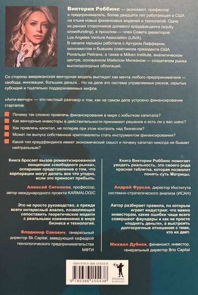 Профессор Виктория Роббинс, экономист, доктор философских наук, родилась в России, в юном возрасте переехала в США, стала успешным предпринимателем, была признана лидером в области венчурного финансирования в цифровую эпоху и приглашена в Белый дом как «чемпион по краудфандингу». Её книга — это масштабное исследование о том, как на самом деле работает финансирование стартапов в США, и о том, почему миф о «чистом капитализме» не выдерживает проверки фактами.