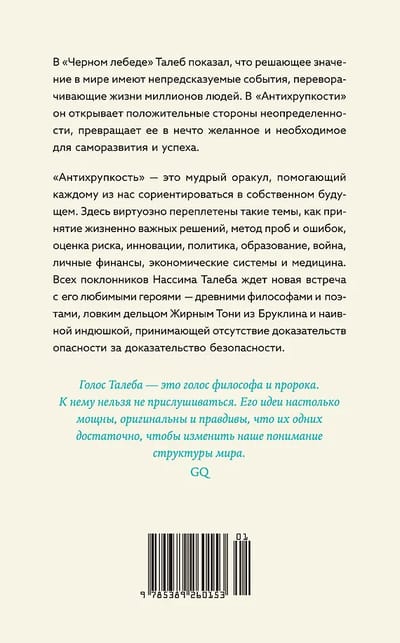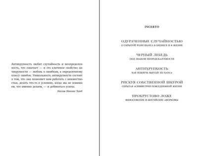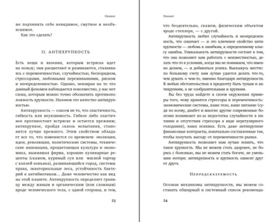 Талеб формулирует простые правила, которые позволяют нам преодолеть хрупкость и действовать так, чтобы непредсказуемая неопределенность, тот грозный и внезапный Черный лебедь, не причинила нам вреда — и более того, чтобы эта редкая и сильная птица помогла нам совершенствоваться. Для этого следует в первую очередь осознать: мы по природе своей антихрупки и не должны позволять кому бы то ни было лишать нас этого чудесного свойства.