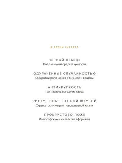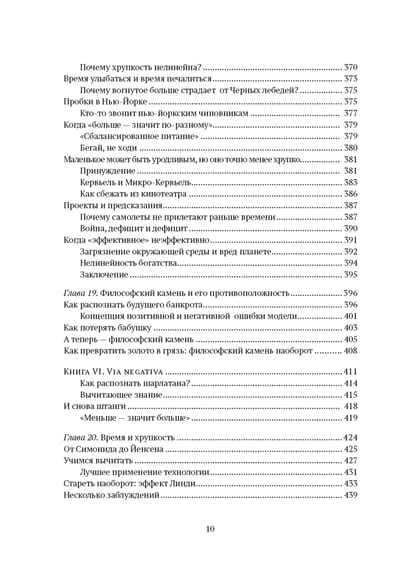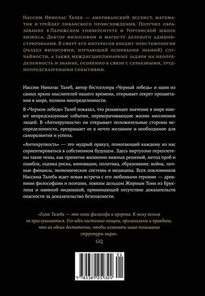 «Антихрупкость» — книга уникальная: она рассказывает о ключевом свойстве людей, систем и не только, свойстве, у которого до сих пор не было названия. В мире, где царит неопределенность, нельзя желать большего, чем быть антихрупким, то есть уметь при столкновении с хаосом жизни не просто оставаться невредимым, но и становиться лучше прежнего, эволюционировать, развиваться. Талеб формулирует простые правила, которые позволяют нам преодолеть хрупкость и действовать так, чтобы непредсказуемая неопределенность, тот грозный и внезапный Черный лебедь, не причинила нам вреда — и более того, чтобы эта редкая и сильная птица помогла нам совершенствоваться. Для этого следует в первую очередь осознать: мы по природе своей антихрупки и не должны позволять кому бы то ни было лишать нас этого чудесного свойства.