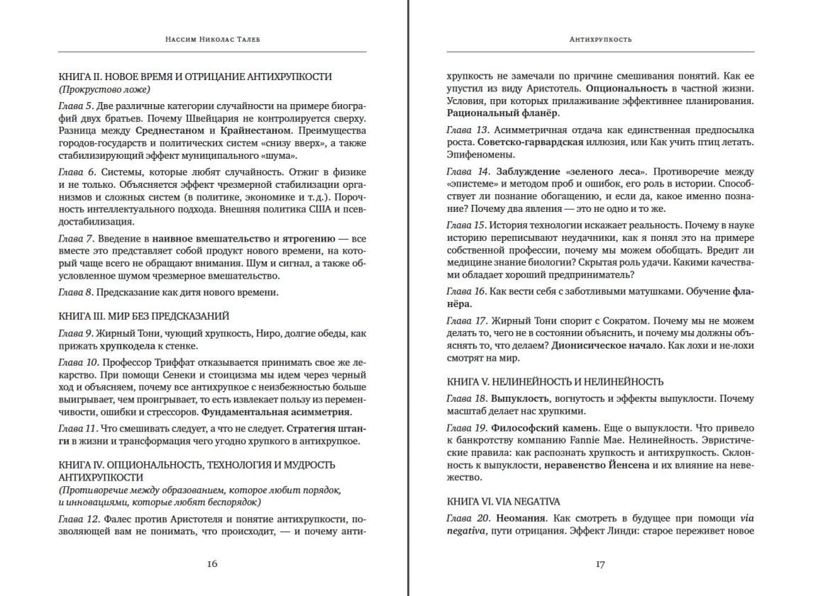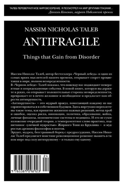 «Антихрупкость» — книга уникальная: она рассказывает о ключевом свойстве людей, систем и не только, свойстве, у которого до сих пор не было названия. В мире, где царит неопределенность, нельзя желать большего, чем быть антихрупким, то есть уметь при столкновении с хаосом жизни не просто оставаться невредимым, но и становиться лучше прежнего, эволюционировать, развиваться. Талеб формулирует простые правила, которые позволяют нам преодолеть хрупкость и действовать так, чтобы непредсказуемая неопределенность, этот грозный и внезапный Черный лебедь, не причинила нам вреда — и более того, чтобы эта редкая и сильная птица помогла нам совершенствоваться. Для этого следует в первую очередь осознать: мы по природе своей антихрупки — и не должны позволять кому бы то ни было лишать нас этого чудесного свойства.