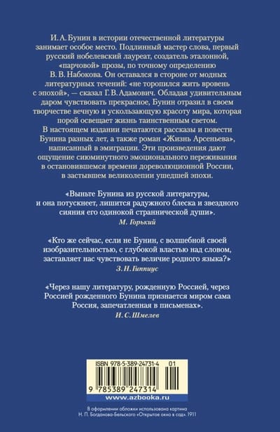 И. А. Бунин в истории отечественной литературы занимает особое место. Подлинный мастер слова, первый русский нобелевский лауреат, создатель эталонной, «парчовой» прозы, по точному определению В. В. Набокова. Он оставался в стороне от модных литературных течений: «не торопился жить вровень с эпохой», — сказал Г. Адамович. Обладая удивительным даром чувствовать прекрасное, Бунин отразил в своем творчестве вечную и ускользающую красоту мира, которая порой освещает жизнь таинственным светом. В настоящем издании печатаются рассказы и повести Бунина разных лет, а также роман «Жизнь Арсеньева», написанный в эмиграции. Эти произведения дают ощущение сиюминутного эмоционального переживания в остановившемся времени дореволюционной России, в застывшем великолепии ушедшей эпохи.