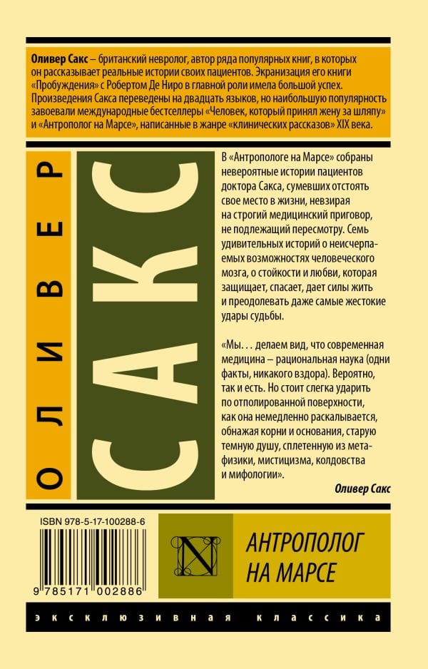 В "Антропологе на Марсе" собраны невероятные истории пациентов доктора Сакса, сумевших отстоять свое место в жизни, невзирая на строгий медицинский приговор, не подлежащий пересмотру. Семь удивительных историй о неисчерпаемых возможностях человеческого мозга, о стойкости и любви, которая защищает, спасает, дает силы жить и преодолевать даже самые жестокие удары судьбы.