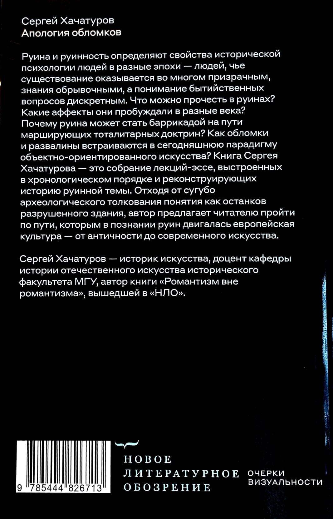 Руина и руинность определяют свойства исторической психологии людей в разные эпохи — людей, чье существование оказывается во многом призрачным, знания обрывочными, а понимание бытийственных вопросов — дискретным. Что можно прочесть в руинах? Какие аффекты они пробуждали в разные века? Почему руина может стать баррикадой на пути марширующих тоталитарных доктрин? Как обломки и развалины встраиваются в сегодняшнюю парадигму объектно-ориентированного искусства? Книга Сергея Хачатурова — это собрание лекций-эссе, выстроенных в хронологическом порядке и реконструирующих историю руинной темы. Отходя от сугубо археологического толкования понятия как останков разрушенного здания, автор предлагает читателю пройти по пути, которым в познании руин двигалась европейская культура — от античности до современного искусства. Сергей Хачатуров — историк искусства, доцент кафедры истории отечественного искусства исторического факультета МГУ, автор книги «Романтизм вне романтизма», вышедшей в «НЛО».