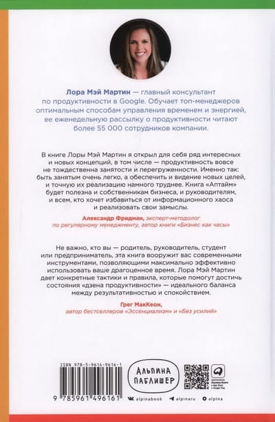Как часто вы засиживались в офисе допоздна, чтобы закончить важный проект, а дома тратили время на рутину и обучение, хотя хотели просто лечь и забыться за любимым сериалом? Каждый день мы стараемся работать быстрее и успевать как можно больше, но это ведет к стрессу, прокрастинации и выгоранию. Известный эксперт по продуктивности, коуч топ-менеджеров компании Google и мама троих детей Лора Мэй Мартин уверена, что продуктивность измеряется не временем, которое мы проводим за работой. Бесконечную погоню за продуктивностью она предлагает заменить революционной концепцией управления энергией. Автор взяла из ИТ-сферы термин «аптайм» — время, в течение которого компьютер продуктивно работает, — и объясняет, как использовать время, в течение которого продуктивно работаете вы. Аптайм — это наши «часы силы», когда мы получаем удовольствие от того, что делаем, а наши энергия и сосредоточенность находятся на высоте. В книге Лора Мэй Мартин рассказывает, как научиться пользоваться этим временем, делится проверенными стратегиями управления энергией, объясняет, как расставить приоритеты, определить свои пики продуктивности и использовать их, чтобы достигать лучших результатов, не выгорая.