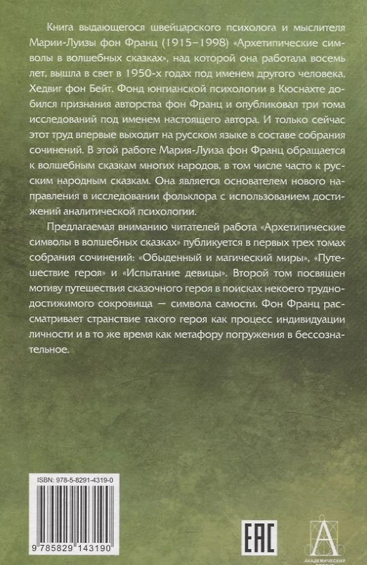 В этой работе Мария-Луиза фон Франц обращается к волшебным сказкам многих народов, в том числе часто к русским народным сказкам. Она является основателем нового направления в исследовании фольклора с использованием достижений аналитической психологии.