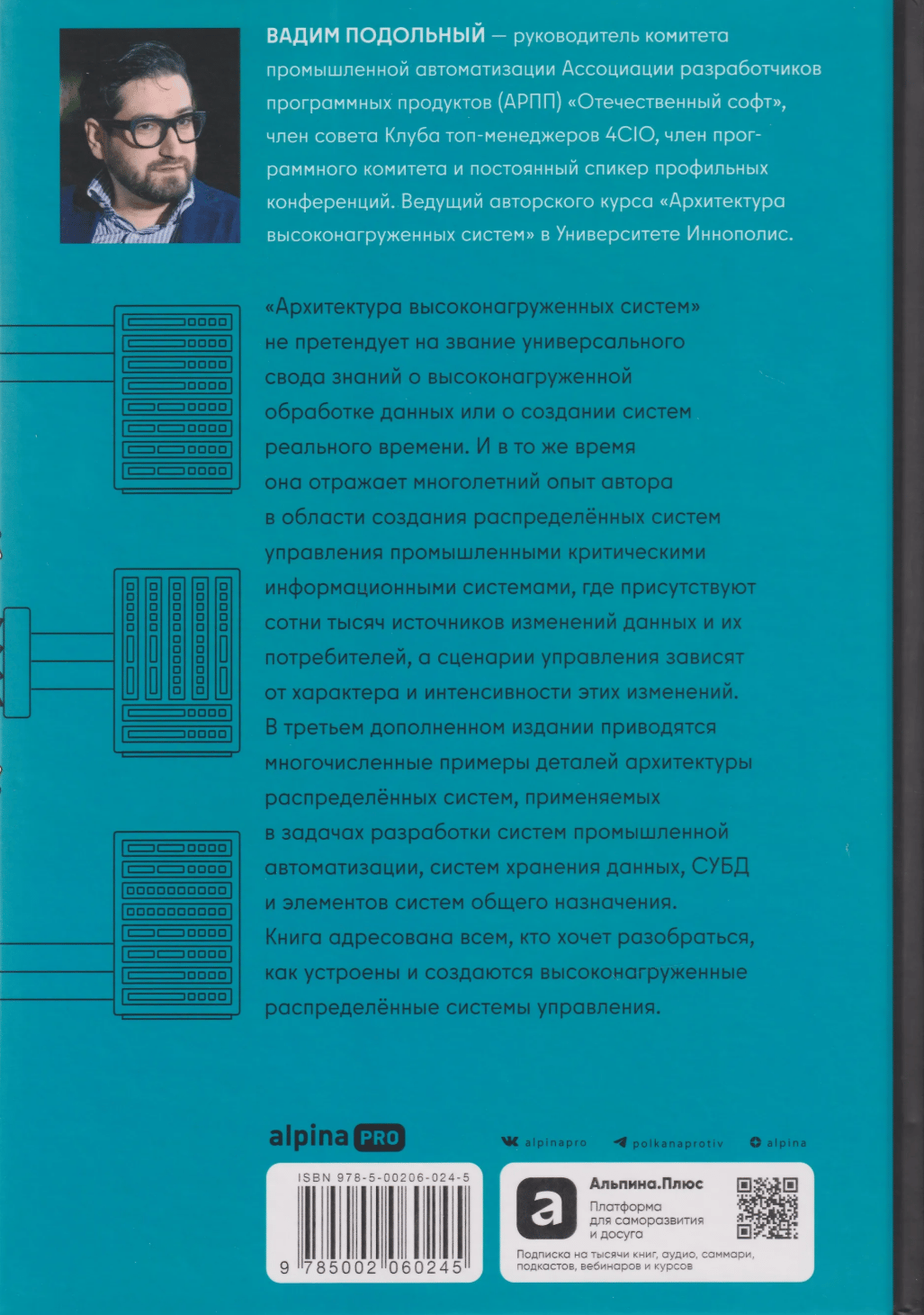 «Архитектура высоконагруженных систем» не претендует на звание универсального свода знаний о высоконагруженной обработке данных или о создании систем реального времени. И в то же время она отражает многолетний опыт автора в области создания распределённых систем управления промышленными критическими информационными системами, где присутствуют сотни тысяч источников изменений данных и их потребителей, а сценарии управления зависят от характера и интенсивности этих изменений.