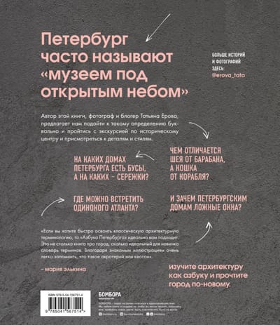 Петербург часто называют «музеем под открытым небом». Автор этой книги, фотограф и блогер Татьяна Ерова, предлагает нам подойти к такому определению буквально и пройтись с экскурсией по историческому центру и присмотреться к деталям. Дома, так непохожие друг на друга, объединяют формы и стили, конструктивные и декоративные элементы. Каждая часть на фасаде здания имеет свое название. С такими, как, например, атлант, балкон, колонна или шпиль, многие знакомы, но большинство терминов известны лишь строителям, архитекторам и инженерам. Эта книга расскажет вам историю архитектуры на примере сотни фотографий Петербурга. Пилястры, фонари, уши, кариатиды и бусы, розетки и яблоки – все эти названия вы встретите в книге, научитесь отличать их и быстро находить во время прогулок. Изучите архитектуру как азбуку и прочтите город по-новому.