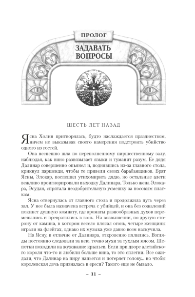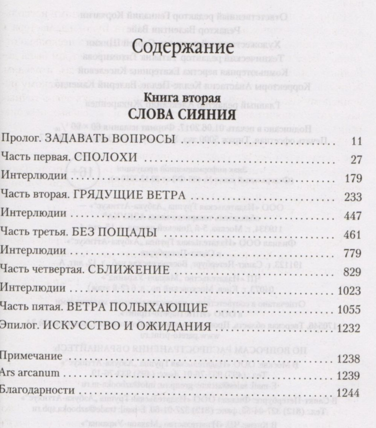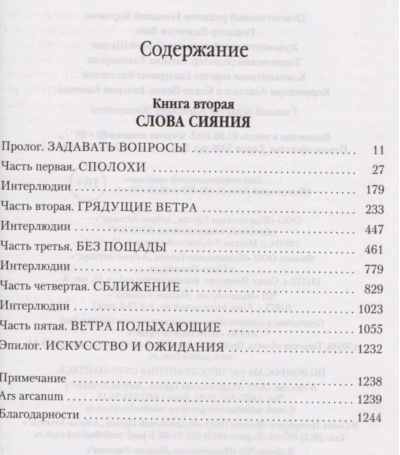 Вопреки ожиданиям врагов, Каладин Благословенный Бурей не умер рабом, но возглавил личную гвардию великого князя, и теперь на его плечах лежит обязанность защищать самого короля. Убийца в Белом вновь сеет смерть по всему Рошару, шаг за шагом приближаясь к главной цели — Далинару Холину. Шаллан Давар ставит перед собой самую амбициозную цель из всех возможных: предотвратить возвращение Приносящих пустоту, за которым должна последовать гибель всего мира. А в это время в сердце Расколотых равнин паршенди, уставшие от многолетней войны, делают роковой выбор и обращаются за помощью к той самой силе, от которой некогда бежали их предки. Выдержат ли герои новые испытания? Станут ли новыми Сияющими рыцарями?