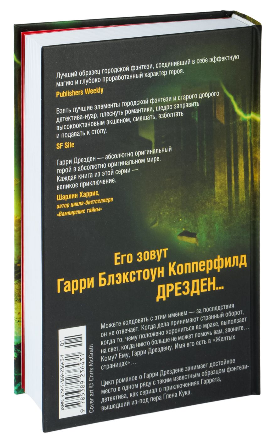 Его зовут Гарри Блэкстоун Копперфилд Дрезден. Можете колдовать с этим именем — за последствия он не отвечает. Когда дела принимают странный оборот, когда то, чему положено хорониться во мраке, выползает на свет, когда никто больше не может помочь вам, звоните... Кому? Ему, Гарри Дрездену. Имя его есть в «Желтых cтраницах»… Нет, это невероятно! Вроде бы все готовы мирно разрешить разногласия и подтвердить свое участие в Неписаном договоре — и старейшины Белого Совета, и Белая Коллегия вампиров, и свартальвы, и вурдалаки, и даже некоронованный подпольный король Чикаго «джентльмен» Джонни Марконе — и вдруг… В замок, где назначена встреча всех участников намеченной встречи, прибывает последняя из титанов, Этне, владелица самого сокрушительного оружия, которое есть на свете, и объявляет: «Если до ведьмина часа каждый из здесь присутствующих не сделает выбор: отринуть смертный мир или сгореть вместе с ним, — то мир смертных будет разрушен». Гарри Дрезден! Слышишь? Сделай хоть что-нибудь!
