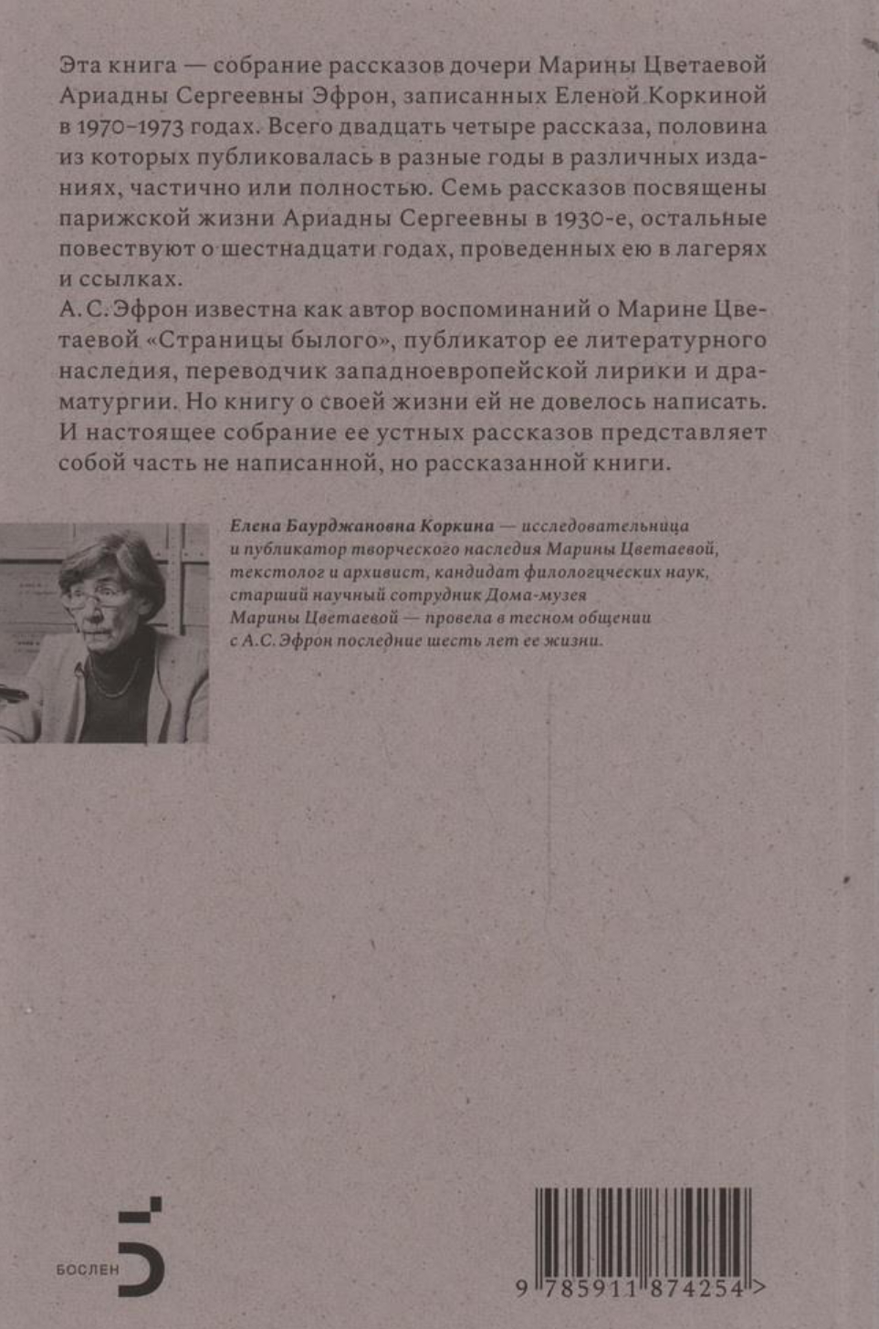 Эта книга — собрание рассказов дочери Марины Цветаевой Ариадны Сергеевны Эфрон, записанных Еленой Коркиной в 1970–1973 годах. Всего двадцать четыре рассказа, семь из которых посвящены парижской жизни Ариадны Эфрон в 1930-е, остальные повествуют о шестнадцати годах, проведенных ею в лагерях и ссылках. А. С. Эфрон известна как автор воспоминаний о Марине Цветаевой «Страницы былого», публикатор ее литературного наследия, переводчик западноевропейской лирики и драматургии. Но книгу о своей жизни ей не довелось написать. И настоящее собрание ее устных рассказов представляет собой часть не написанной, но рассказанной книги.