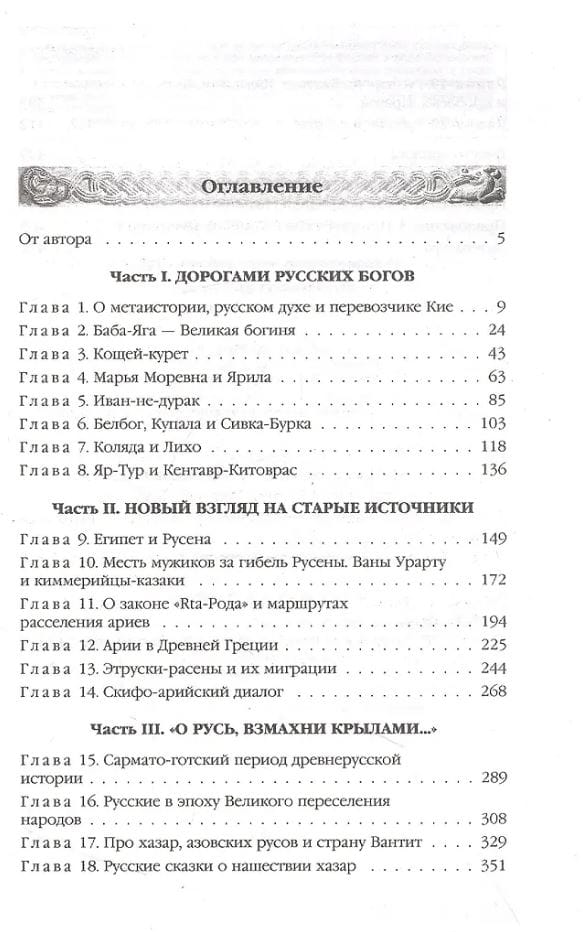 В книге подробно рассмотрены родословные русских богов (Бабы Яги, Ярилы, Коляды, Ивана, Марьи и др.) и мифологические параллели, обозначавшие маршруты расселения ариев, а также многие спорные вопросы образования Русского государства, предыстории Киевской и Азовской Руси, хазарской проблемы и пресловутой «норманнской теории».