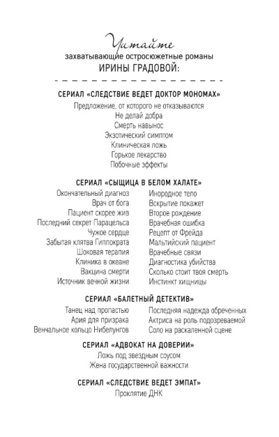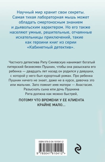 Частного детектива Риту Синявскую нанимает богатый питерский бизнесмен Пушнин, чтобы она разыскала его ребенка — двадцать лет назад он родился у девушки, с которой у него был курортный роман. Про ребенка Пушнин ничего не знает, даже не в курсе, девочка это или мальчик. Зато помнит имя матери – Анастасия. Разыскать сына или дочь Пушнина Рита должна как можно быстрей, потому что времени у ее клиента крайне мало...