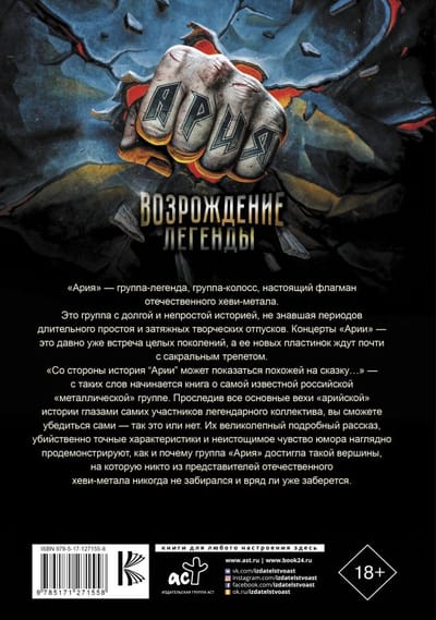 «Со стороны история «Арии» может показаться похожей на сказку...» — с таких слов начинается книга о самой известной российской «металлической» группе. Проследив все основные вехи «арийской» истории глазами самих участников легендарного коллектива, вы сможете убедиться сами — так это или нет. Их великолепный подробный рассказ, убийственно точные характеристики и неистощимое чувство юмора наглядно продемонстрируют, как и почему группа «Ария» достигла такой вершины, на которую никто из представителей отечественного хеви‑метала никогда не забирался и вряд ли уже заберется.