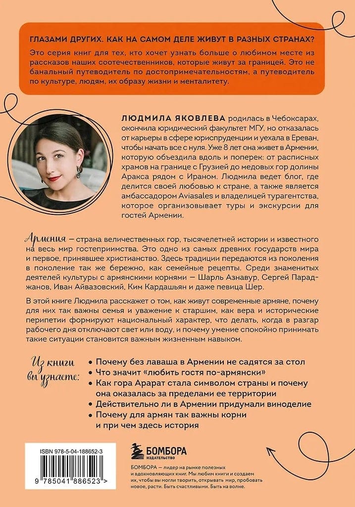 В этой книге Людмила Яковлева — блогер, путешественница, амбассадор Aviasales и основатель турагентства — приглашает вас в увлекательное путешествие по своей второй родине. Когда-то она оставила успешную юридическую карьеру в Москве и начала новую жизнь в Ереване. Сегодня она знает Армению такой, какой ее видят только местные жители.