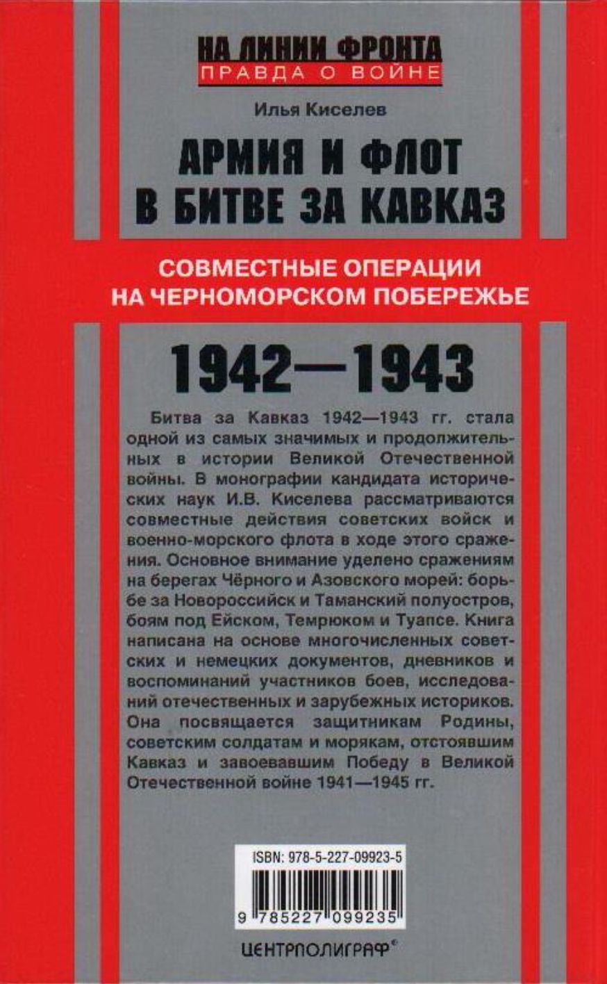 Битва за Кавказ 1942—1943 гг. стала одной из самых значимых и продолжительных в истории Великой Отечественной войны. В монографии кандидата исторических наук И.В. Киселева рассматриваются совместные действия советских войск и военно-морского флота в ходе этого сражения. Основное внимание уделено сражениям на берегах Черного и Азовского морей: борьбе за Новороссийск и Таманский полуостров, боям под Ейском, Темрюком и Туапсе. Книга написана на основе многочисленных советских и немецких документов, дневников и воспоминаний участников боев, исследований отечественных и зарубежных историков. Она посвящается защитникам Родины, советским солдатам и морякам, отстоявшим Кавказ и завоевавшим Победу в Великой Отечественной войне 1941—1945 гг.