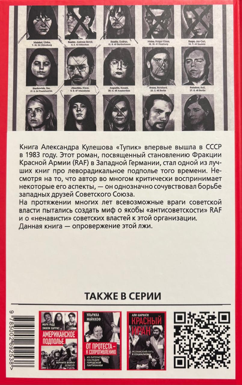 Книга Александра Кулешова «Тупик» впервые вышла в СССР в 1983 году. Этот роман, посвященный становлению Фракции Красной Армии (RAF) в Западной Германии, стал одной из лучших книг про леворадикальное подполье того времени. Несмотря на то, что автор во многом критически воспринимает некоторые его аспекты, – он однозначно сочувствовал борьбе западных друзей Советского Союза. На протяжении многих лет всевозможные враги советской власти пытались создать миф о якобы «антисоветскости» RAF и о «ненависти» советских властей к этой организации. Данная книга – опровержение этой лжи.