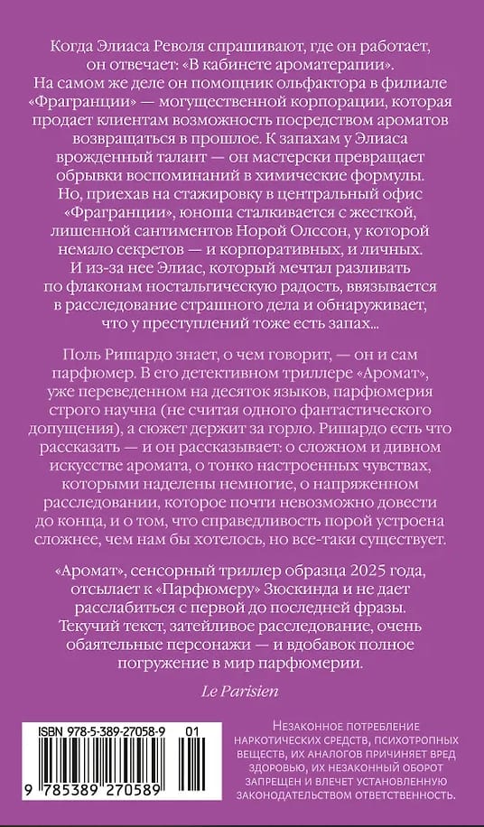 Поль Ришардо знает, о чем говорит, — он и сам парфюмер. Ришардо воспитан на «Парфюмере» Зюскинда и «твердой» научной фантастике, и потому в его сенсорном триллере «Аромат» парфюмерия строго научна (не считая одного фантастического допущения), а сюжет держит за горло. Даже его вымышленная зловещая корпорация родилась из реально ходившего во французских профессиональных кругах анекдота о том, как некто планировал подпольно ароматизировать алкоголь, чтобы потом контрабандой ввозить его в СССР.